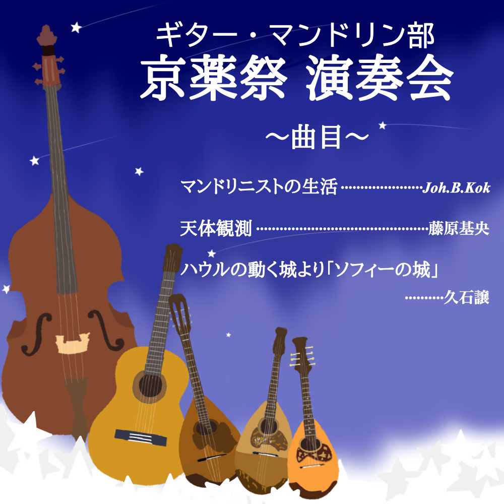 ギター・マンドリン部です!3回生1人2回生14人1回生7人で活動しています!「マンドリニストの生活」と「天体観測」と「ハウルの動く城より「ソフィーの城」」を演奏します!ぜひ聞きに来てください!